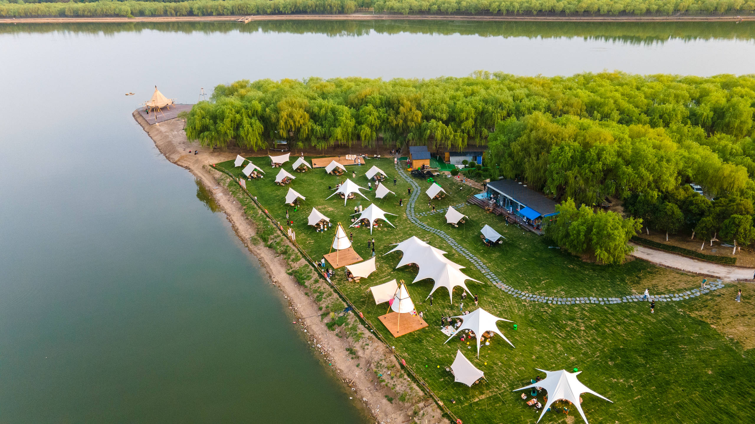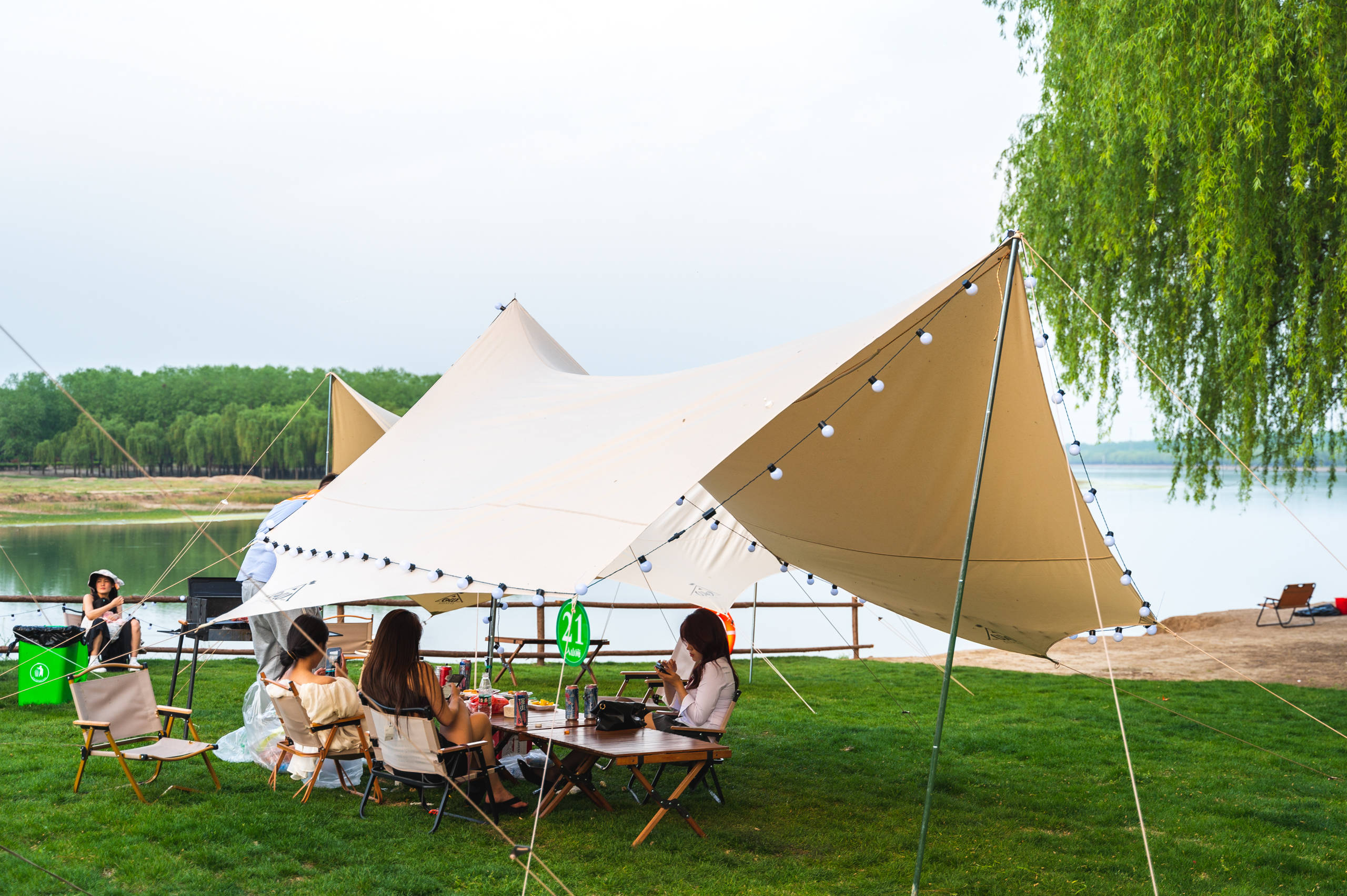 整个营地分为两大部分,引河河畔露天的营地和新汴河畔藏在林子里的营地,帐篷数十顶,规模颇大。从空中俯瞰,双河交汇的营地景色相当壮观,清幽的环境,清澈的河水,真的是理想中的露营地。