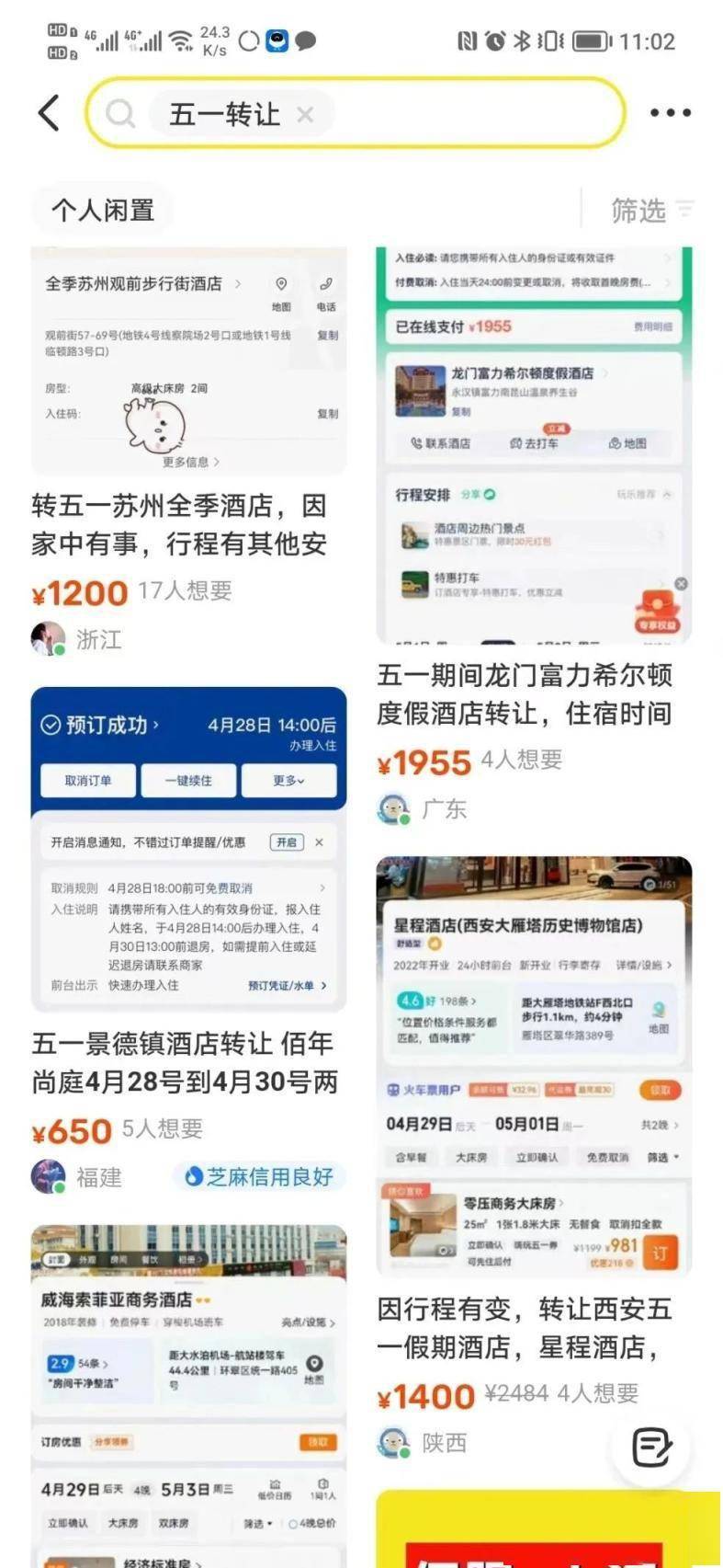 发布转让“五一”酒店客房的,在小红书、闲鱼等平台用的最多的理由是,“行程有变”“临时有事”“没抢到去的票”等等。还有不少称“商家涨价太夸张,怕便宜商家,退掉的话不划算。想以比较合理的价格转让给更需要的人”。