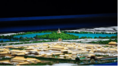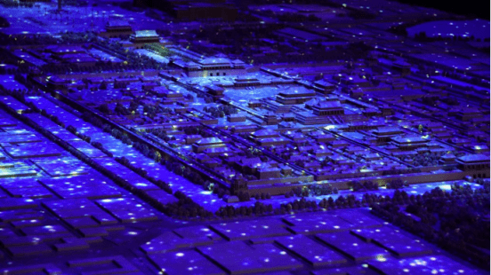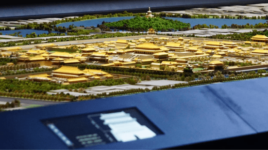 通过长达16米的巨型实景沙盘和虚拟数字融合技术营造站在数百米高空的超级视角,从宏观与微观的角度展现出中轴线气势恢宏、秩序严谨的壮美景观 ,打破时空限制, 让观众在几分钟内通过视、听、触等多感知方式身临其境地感受中轴线纵贯古今的文化风貌和日夜四季轮转, 这也是首都博物馆将展览叙事空间进行数字剧场化的首次实践。