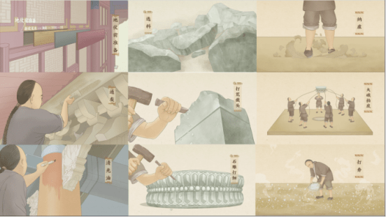 王泊乔和他的创作团队在前期多次与原故宫博物院古建修缮中心主任李永革教授面对面沟通,以《中国古建筑瓦石营法》为蓝本,对八大技艺的选料、制作工艺和工序梳理一一考据,最终采取手绘二维动画的形式,生动演绎瓦木扎石土、油漆彩画糊的这八项传统技艺,其中彩画作起笔落墨之际彩画跃然于木;石作用稳重承载住威严,用坚韧吸纳着气脉;木作尽错综之美,穷技巧之变;裱糊纸张铺满之际,厅壁共为一色……我们希望通过艺术家手绘八大技艺的每一个步骤,致敬八大工艺传承至今凝聚的匠心精神。