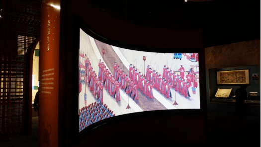 雅乐与古舞在今天已经沉寂,要如何重现中轴线上礼乐交融的景象?“祭祀乐舞”以现藏于故宫博物院的《祭先农坛图》卷一为底本,将古画卷与LED曲面屏结合,对雍正帝前往先农坛谒神农,在中轴线上行祭礼的盛大场景用视听多媒体的方式生动演绎和复现。