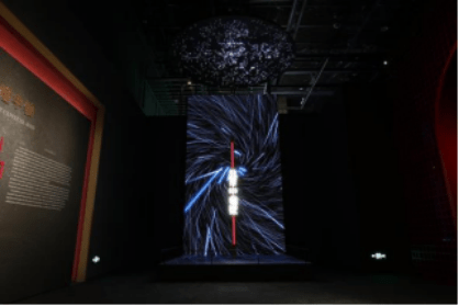 王泊乔带领的中数艺DAC创作团队在前期设计阶段查阅了大量资料追溯北京中轴线的演变过程,研究了二十四节气影长的规律。序厅屏幕装置由展标、立屏和地屏组成,展标形如圭表立杆,立于地中;立屏以抽象粒子模拟宇宙星空、太阳的东升西落、中字演变,星点演变汇聚,从分散到集中演变出了北京中轴线的基本形态;地屏呈现圭表立杆的影子,并通过太阳东升西落的杆影变化规律,演化出子午线,指明中轴线的方向,而后又遵循二十四节气影长规律发生变化,代表时间的变迁。