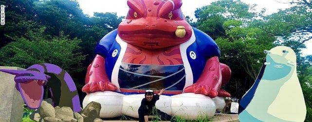 蛤蟆文太可以说是在这个火影公园中一个标志性的元素了,十分的巨大,符合漫画中他的形象。右嘴上叼着一根烟斗,趴在地上,怒视着前方的样子,仿佛是在漫画中,三忍各自召唤通灵兽对决的时刻。