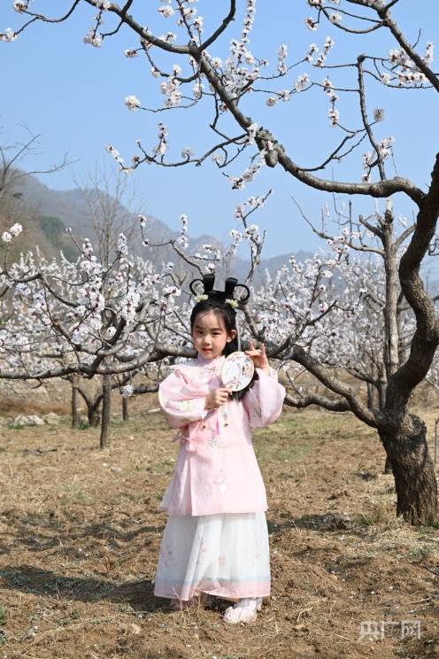 古装“萌娃”在杏花丛中打卡拍照(央广网记者 王进文 摄)