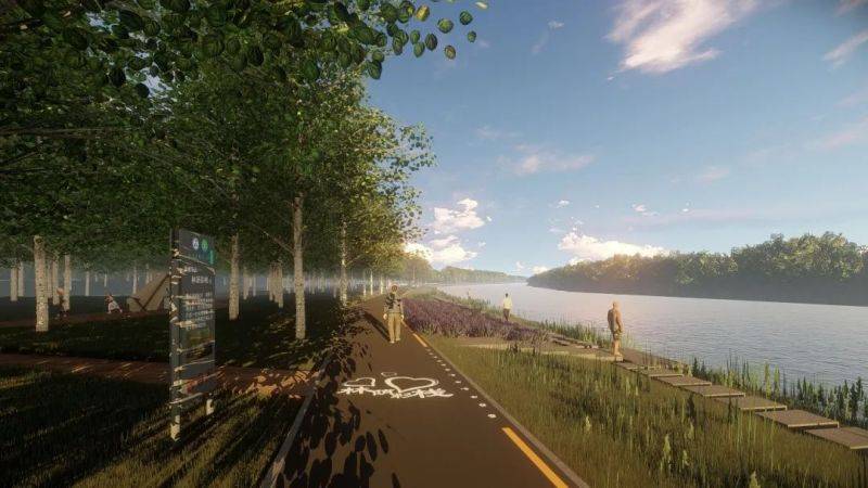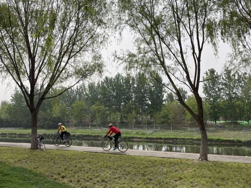曹文雪:原先这是我们河道的防汛道路,河道直线距离是10公里,我们改建成了一个骑行的慢行路,两岸加起来是17公里,然后在河坡上比较缓的地方建了2米宽的滨水步道,一共18公里长。两岸有的是野花组合,有的是雨水花园,四季有景。我们沿线又建了一些便民休闲服务站,像厕所等设施都有。后续我们还会不断地完善设施,比如说座椅、自动售卖点等,让大家的骑行有一个非常舒适的环境。