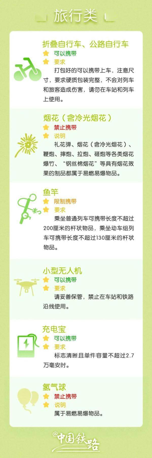 出发前,记得检查一下行李箱,勿携带固体酒精、烟花、氢气球等容易引发危险的物品上火车。