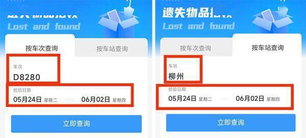 ②如果在列车上遗失物品,选择“按车次查询”;如果在车站内遗失物品,选择“按车站查询”;
