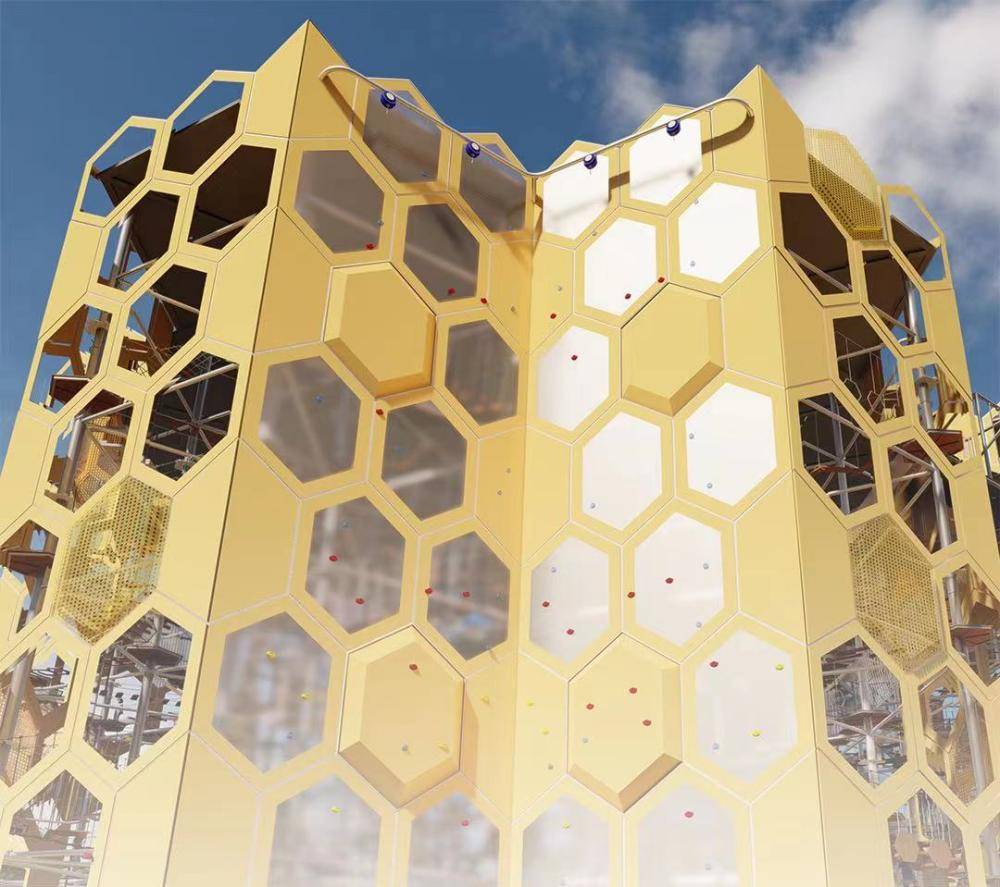 同期开放的高空探险区域由不同难度、超两百多个关卡组成,分别适合初次接触高空项目的新手、有经验的运动爱好者和挑战极限的专业达人。蜂巢塔还拥有国内首创的双螺旋上升赛道,可容纳两支队伍同时对抗。
