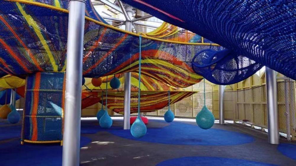 蜂巢塔总攀爬面积约10000平方米,最大承载量为660人/小时。本次率先开放的一层“宇宙探索空间”,是由引力波、星系、粒子、银河和虫洞五种宇宙元素组成的大型手工编织网格空间,它同时还是一个“从一条线变成三维空间”的装置艺术,尤其适合4至10岁儿童锻炼空间感知和攀爬协调能力,激发探索宇宙的兴趣。