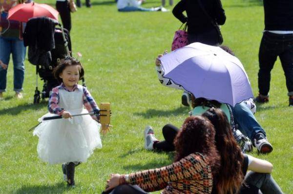 市民在民园广场草坪上享受惬意时光