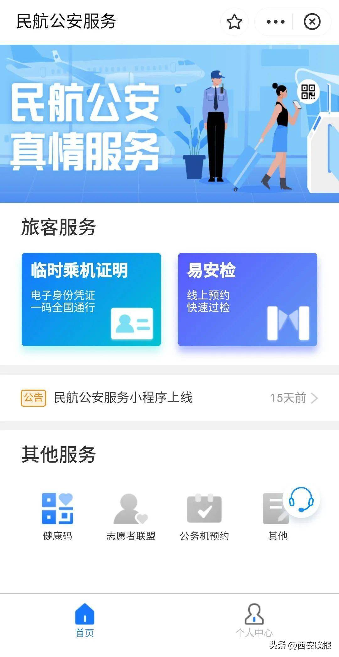 为方便旅客乘机,西安咸阳国际机场向广大旅客推荐“易安检”服务,旅客可在支付宝app中搜索“民航公安服务”小程序进行实名认证和预约,预约成功后即可查看易安检通道引导信息,按照提示前往指定通道,体验更加快捷、高效、舒适的安检服务。