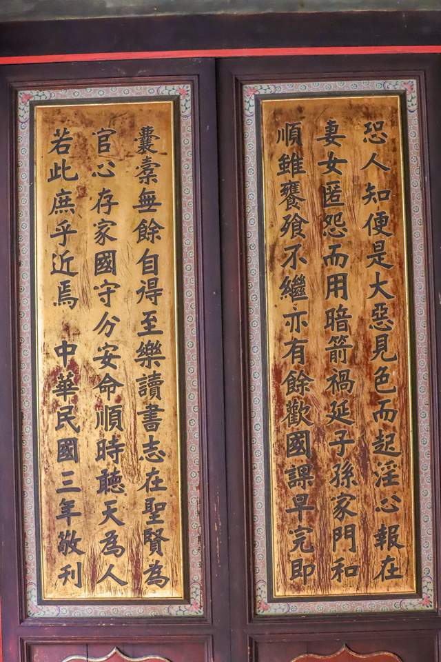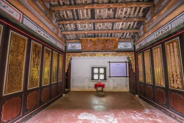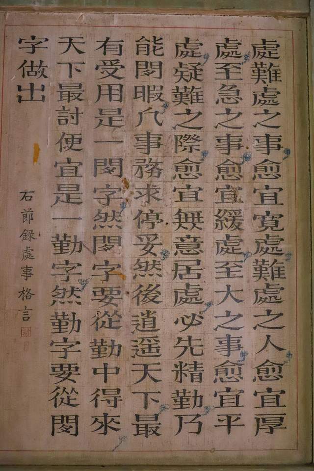 民国三年(1914年)刊刻儒家朱柏庐的 《治家格言》全文,樟木阴刻魏碑体,书法凝重,雕刻精美,气势恢宏,营造了浓厚的民族文化氛围。