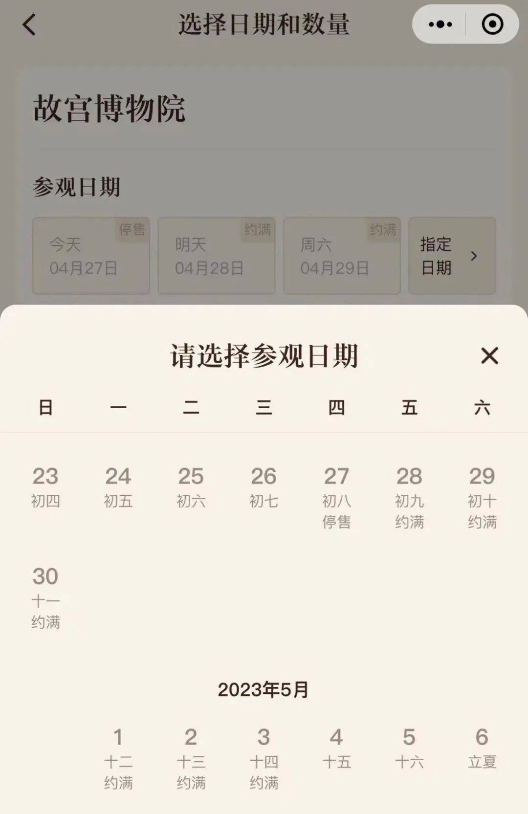 故宫博物院购票小程序显示,故宫博物院4月28日至5月3日的门票已经约满。