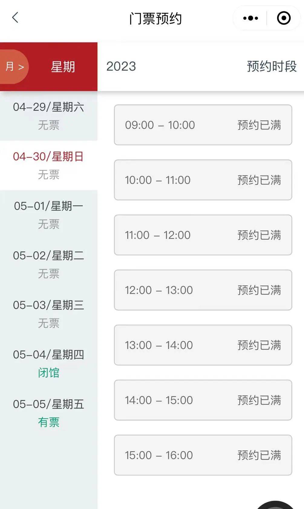 目前,广东省博物馆4月29日至5月3日各个时段的门票已经全部约满,显示无票。