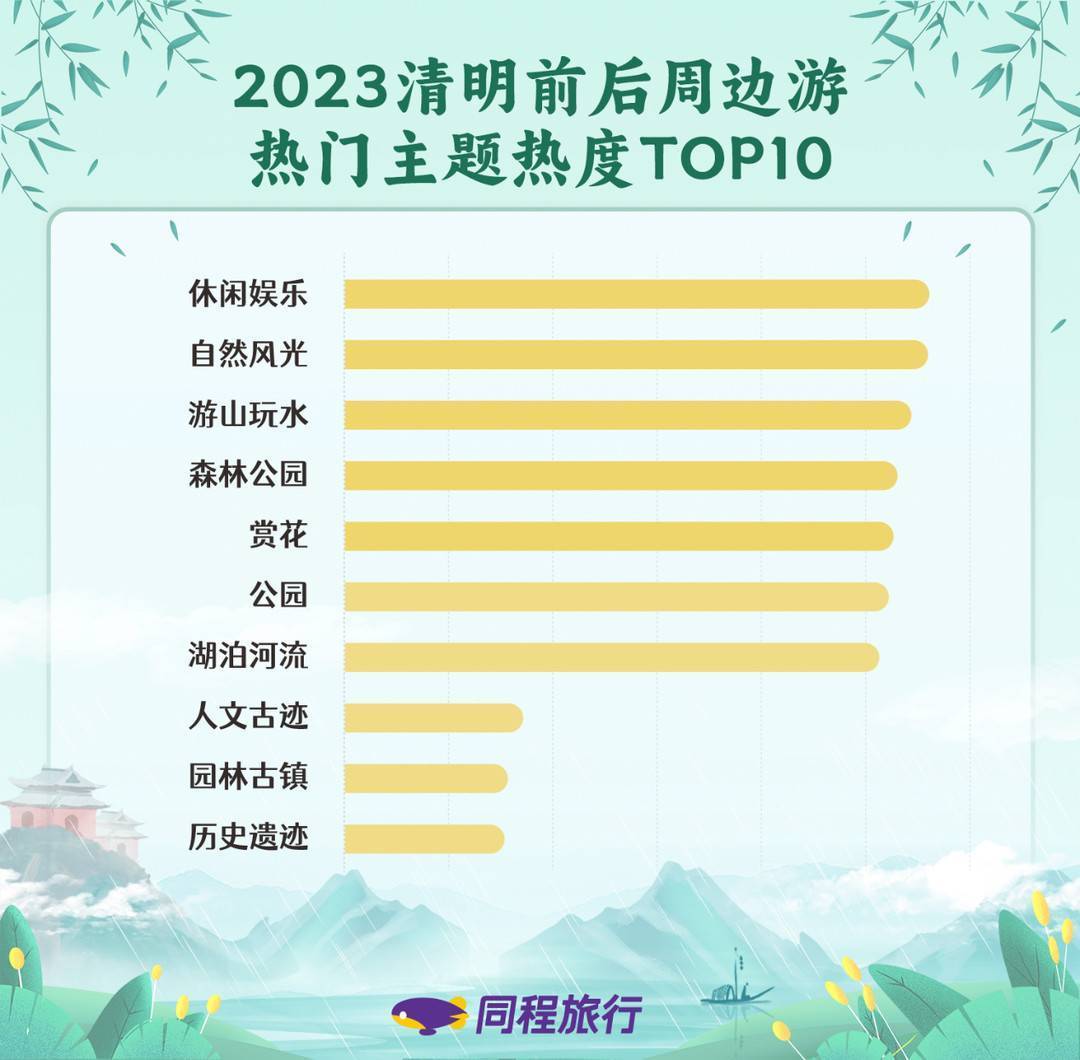 清明期间,本地及周边短途出游是主流,出游主题上具有显著的春游季特征。《报告》数据显示,清明假期(4月5日)前后周边游的热门主题按照热度排序依次为休闲娱乐、自然风光、游山玩水、森林公园、赏花、公园等。前十个热门主题中,具有赏花踏青属性的主题占据了六席。