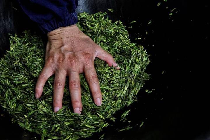 茶叶在200℃的高温里翻滚,抖、搭、搨、捺、甩、抓、推、扣、压、磨等手法轮番上阵,锅不离手、手不离锅。色绿、香郁、味甘、形美的龙井就是这样被炒制出来的。其中温度、色泽、形貌,全凭眼力、手感判断。