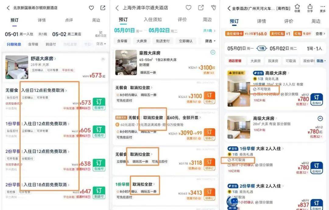 答:这要分情况来看,消费者在下单前要注意预订页面展示的“取消政策”。通常来说,同一房型价格更优惠的则“取消政策”也更严格,比如不可取消/更改,而价格较高的“取消政策”也更宽松,可能到入住当天某一时刻前都可以取消。
