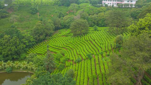 雁南飞茶田景区内的绿意盎然,植被茂密,有许多茶田分布在山间,一望无际的翠绿色让人陶醉。