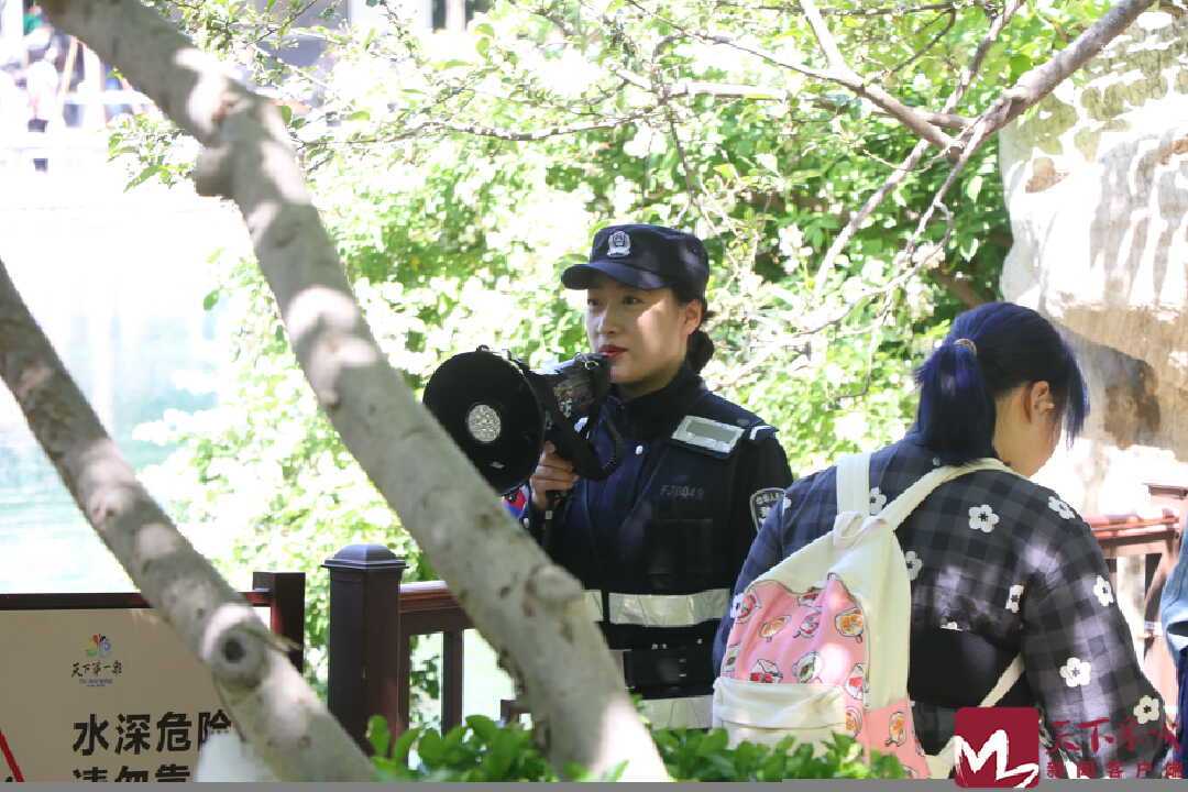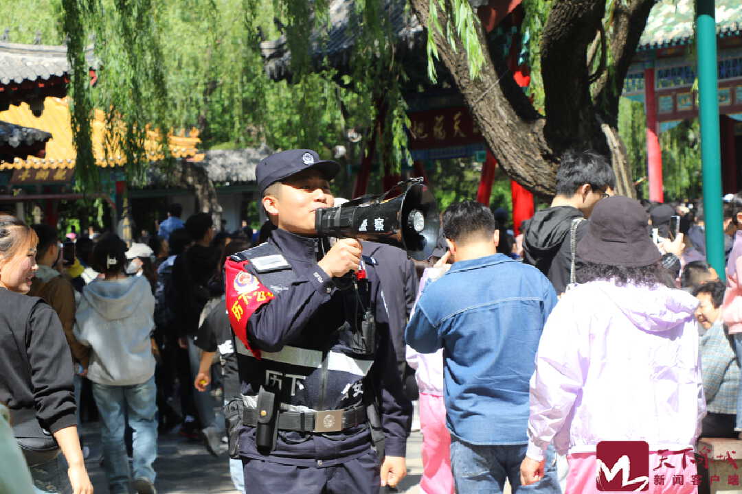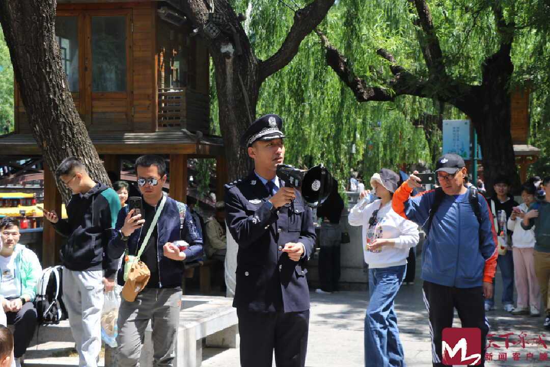 一旁的五龙潭畔,春风拂面、鸟语花香,济南公安辅警杨悦也正喊话提醒游玩的市民注意: