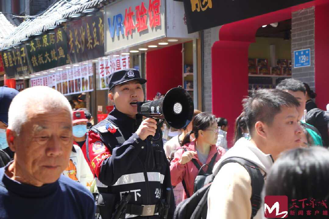 尽管还不到午饭时间,芙蓉街里已经摩肩接踵,为了最大程度减少人员拥挤,芙蓉街也变成了单向通行。人群中,济南公安民警乔进一边行走一边喊话游客: