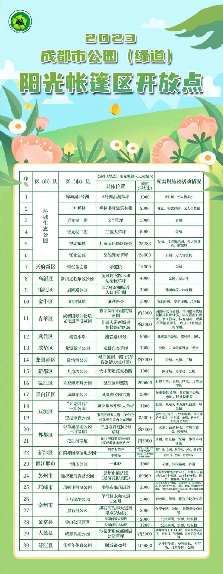 一顶帐篷,一把椅子,在鸟语花香中享受公园城市的春光烂漫。在成都有不少景色超好的露营地点,想要露营的伙伴们可以安排起来了!今年天府迎春赏花节期间,市公园城市局发布了2023成都市公园(绿道)阳光帐篷区开放点位,在去年发布的22个点位基础上新增了30个。