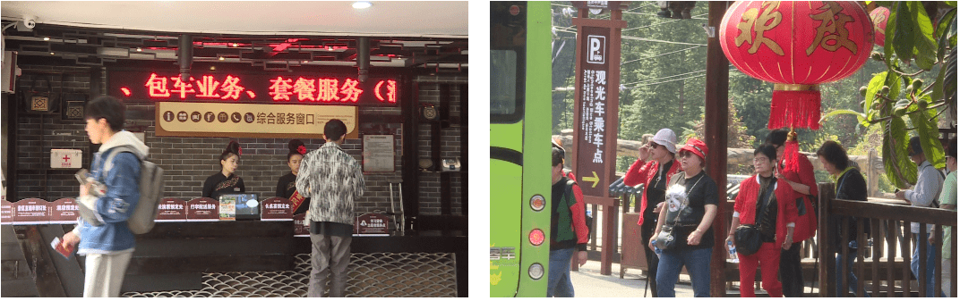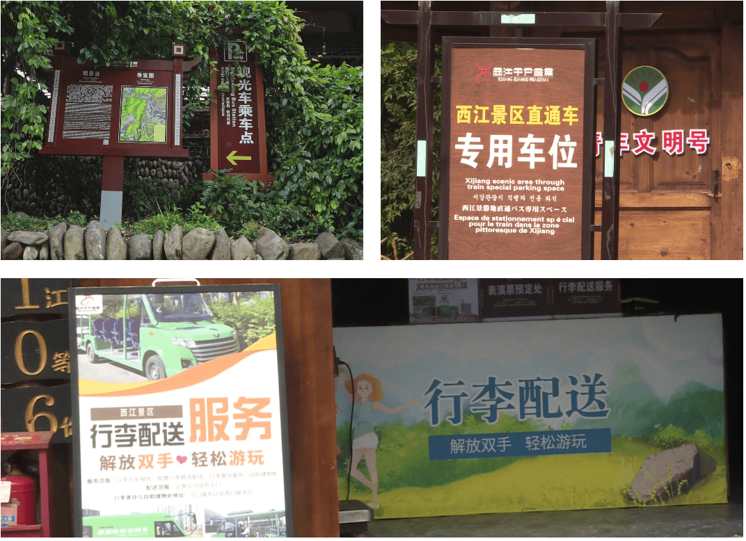 在西江千户苗寨的大北门,游客们有的在服务大厅咨询,有的正秩序井然的检票、换乘观光车进入景区,景区内的各大打卡点都设置有乘车点,路线导航标识清晰明了,方便游客出行。同时景区还开通了行李配送和包车业务。