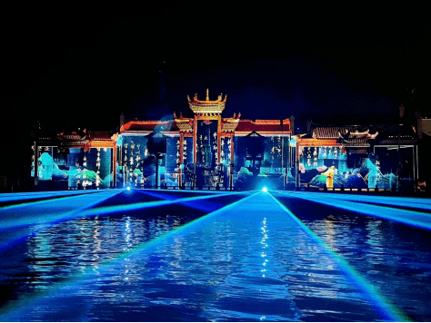 整场演艺不仅有气势如虹的演艺大景,同时从情绪体验的角度考虑,沿岸布局富余层次变化的灯光、雾森,与西岸亲水平台极具先锋创意精神的谯楼月朗装置艺术景观相融合,打造唯美而富文化渗透的全沉浸意境。