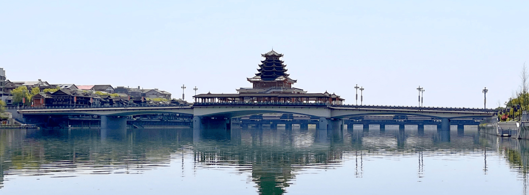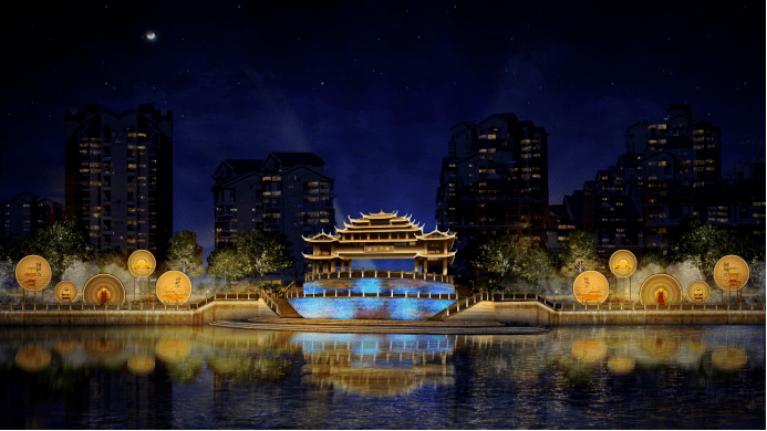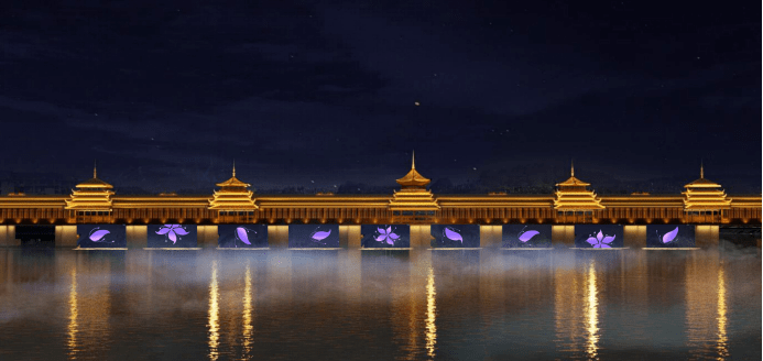 龙津风雨桥作为芷江的侗族风情的文化标志与民俗标志之一,其桥体有17处桥拱,桥体被切割成若干块影像承载面,无法作为浑然一体的完整的演艺内容载体。因考虑到桥梁本身的文化属性,结合数字水帘与灯光,将其打造为吸引和带领游客进入和平湖夜游情境和芷江文化情境的第一站。