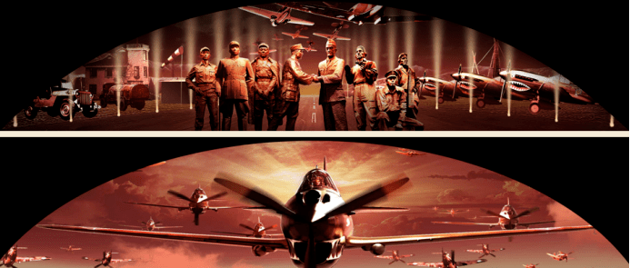 在和平大桥,利用最大两面桥拱,通过专业的荷载测试与专业的设计安装方式,在不影响白天景观效果,保持通透的情况下,采用目前先进可行的透明网屏作为影像载体演艺芷江历史文化脉络上的高光时刻——芷江受降、鹰猎长空与永奠和平。超大规模演艺载体与演艺内容本身所蕴藏的历史悲壮性不谋而合,这也是整场演艺的高潮所在。