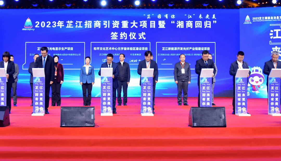 大会期间,举办了2023芷江招商引资重大项目暨“湘商回归”签约仪式,集中签约元宇宙体验、新能源开发等15个重点招商引资项目,集中开工光电显示生产、电子设备制造等7个招商引资项目,举行招商引资项目推介、电子信息产业链招商活动。利亚德集团董事长兼总裁李军响应“湘商回归”的号召,致力于运用先进技术与实力,建设美丽家乡。利亚德集团副总裁、励丰文化执行总裁兼公共文化服务事业部总经理沈时进作为代表上台签约。签约仪式上,利亚德集团与芷江县人民政府达成和平文化艺术中心元宇宙体验区建设项目合作。