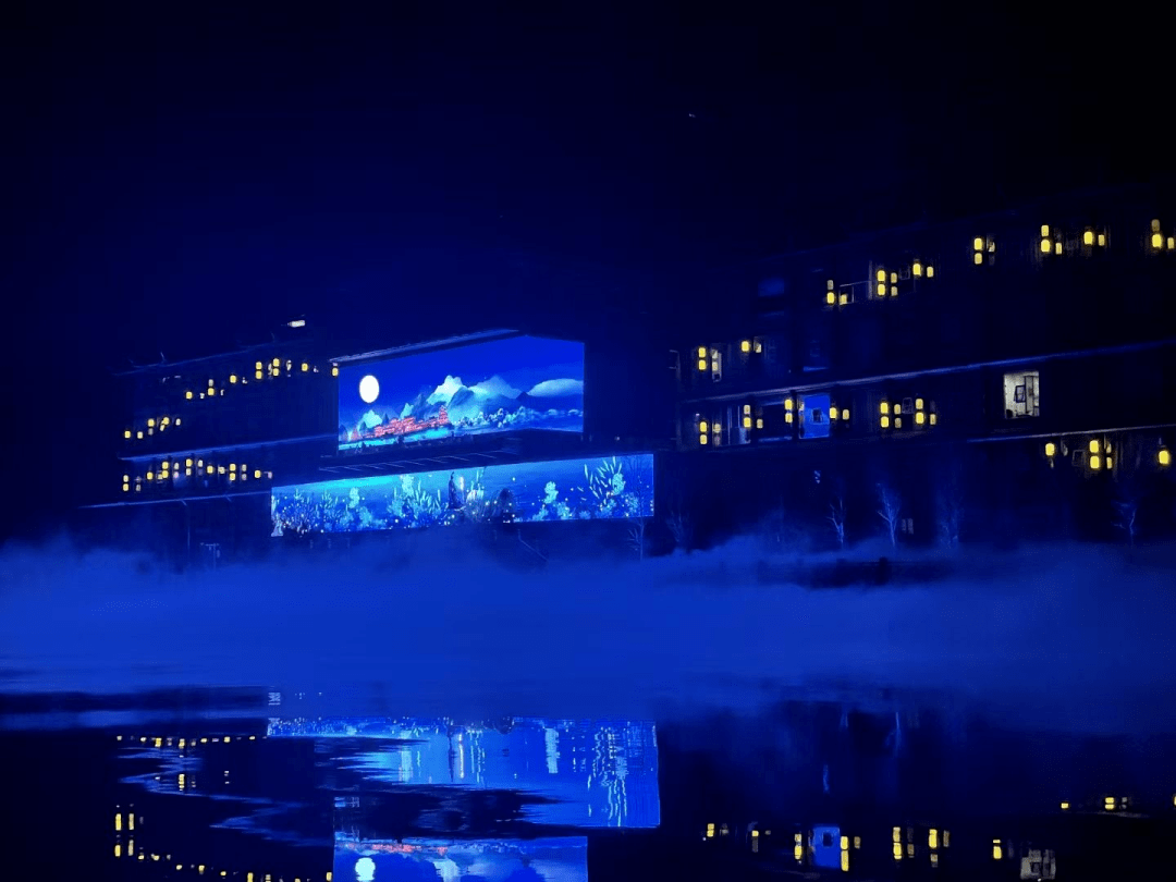 励丰文化策创团队利用山水大酒店凸出的两层玻璃幕墙,通过游船视角计算视线距离与载体的最佳分视觉舒适度,在避免过度设计的前提下,合理选择最佳性价比的P15.6的格栅屏,采用广视角的3D内容创作,呈现《沅有芷兮澧有兰》所蕴藏的芷江之山河壮美。同时,在不影响客房住客的情况下,将酒店外立面以完全融合酒店古建风格的DMS联动控制,控制可变灯笼与裸眼3D内容形成广视角的联动变化。夜幕之下的山水大酒店也因外部造型的丰富层次而成为一座网红打卡地。