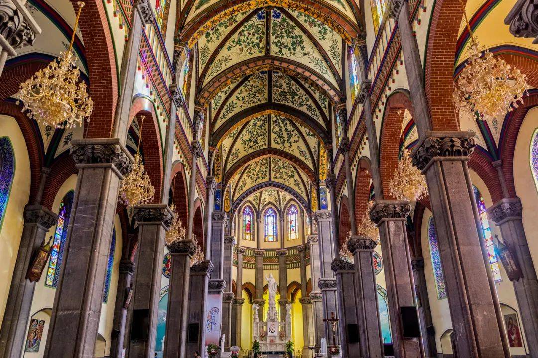 尤其是它的内部,拱顶装饰了彩绘,立柱间挂了吊灯,墙上还装了彩色的玻璃。
