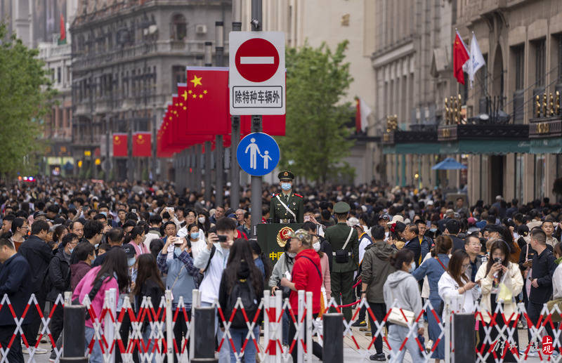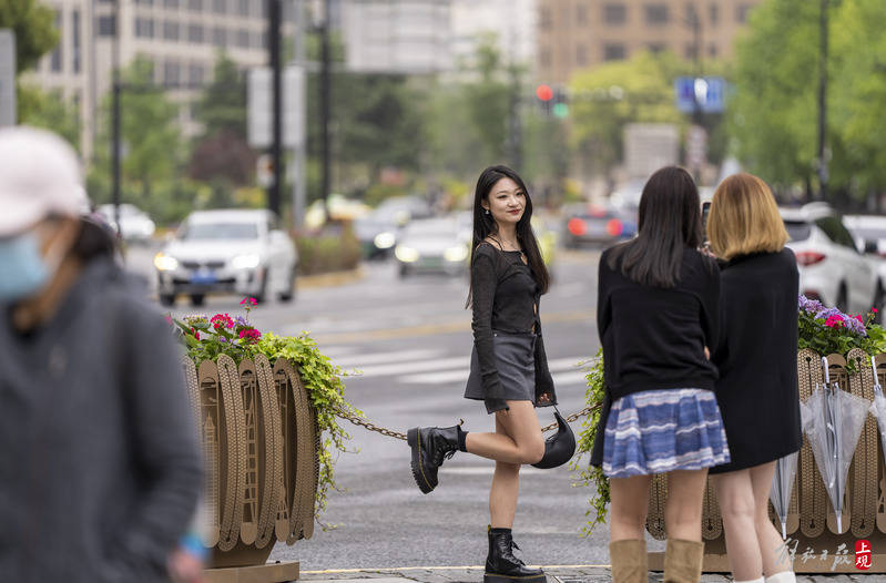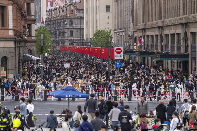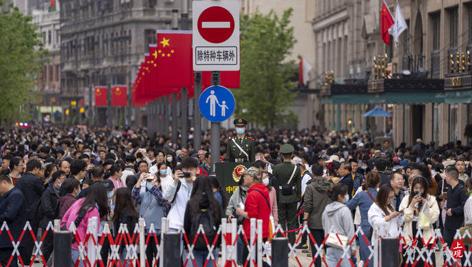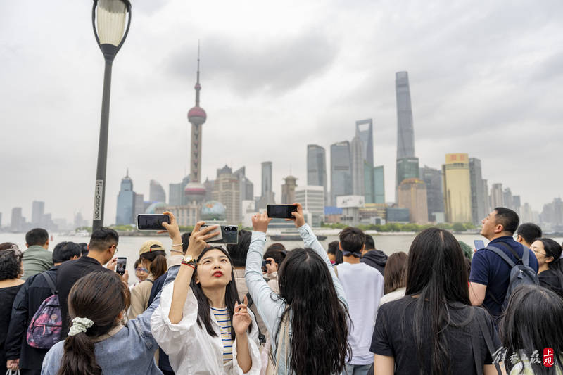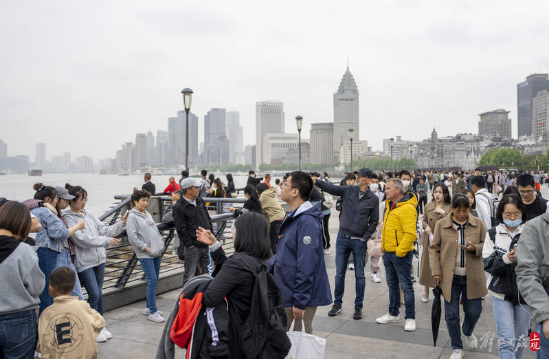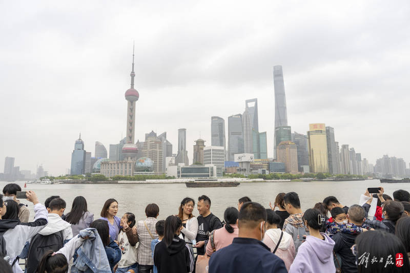 2023年4月29日,“五一”长假首日,申城细雨朦胧,但绵绵细雨丝毫不减外滩“打卡”热。