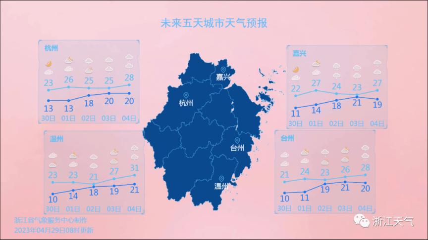 由于冷空气影响较弱,全省各地气温将稳中有升,最高气温会出现30℃+的区域,像温州,5月4日最高气温可升至31℃,外出可感受到初夏的热感。
