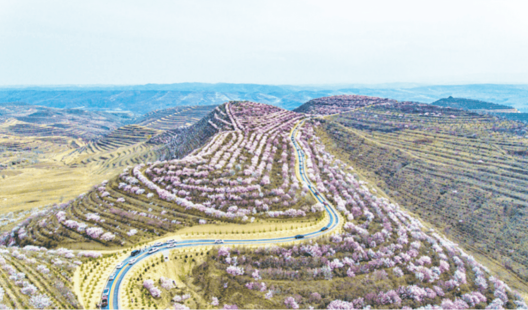 正所谓宁夏梯田看固原,固原梯田看彭阳。彭阳梯田既是黄土高原上梯田的缩影,也是黄土高原生态治理的典范。彭阳金鸡坪梯田公园、嘛喇湾梯田公园、青云湾梯田公园三大核心五彩梯田公园,每年4月山花旅游节游人如织,在“77号彩虹路”加持下,成为新晋网红打卡地。