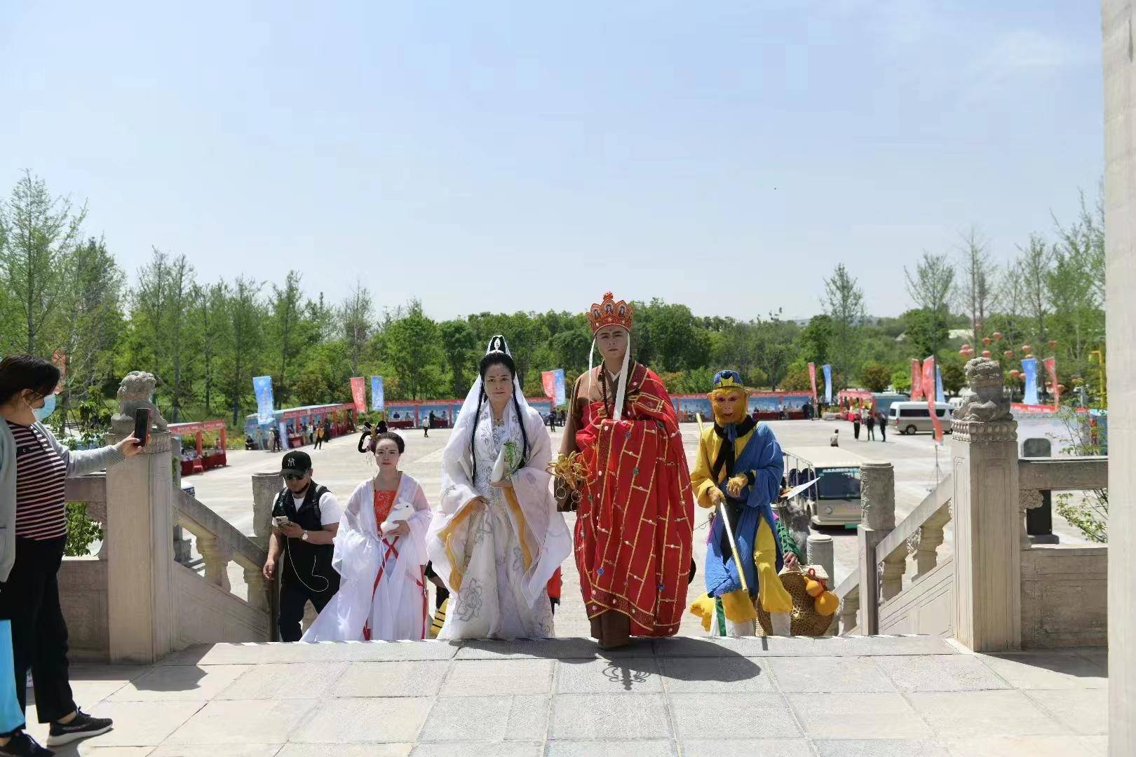 4月29日上午的玄奘故里景区内人头攒动,热闹非凡。千人小手画牡丹、非遗剪纸展示、“唐僧师徒”节目展演、“凤鸣陈河”无人机表演等一系列精彩节目吸引了大批游客围观、参与互动。