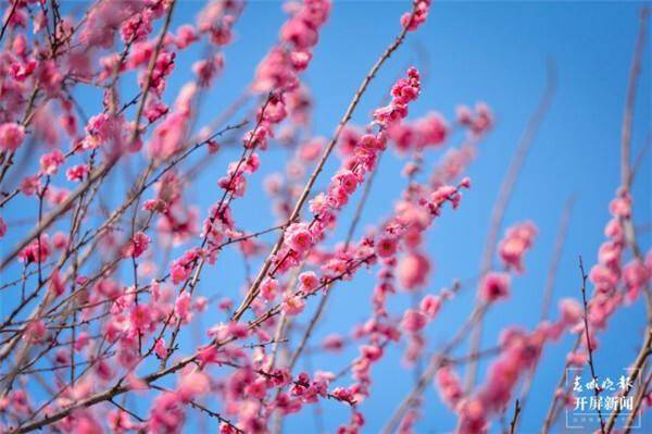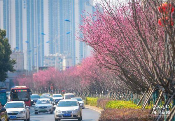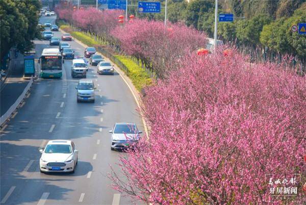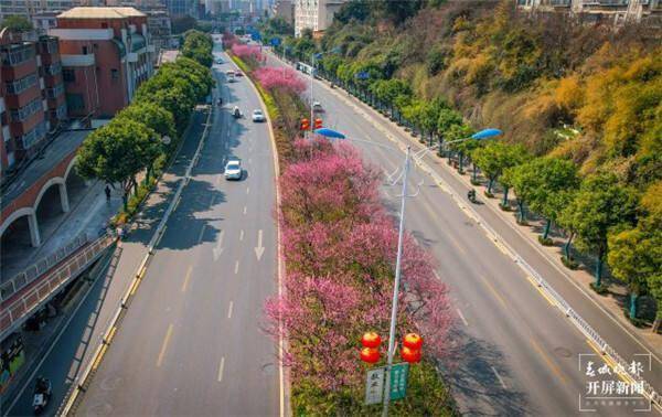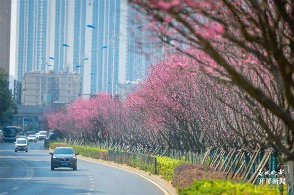 春为一岁首,梅占百花魁。初春时节,昆明龙泉路上的梅花盛开,一朵朵粉艳的梅花绽放枝头,或红或白,争奇斗艳,恰似一条粉色梦幻带飘逸在北市区,将道路街景装点得格外美丽。