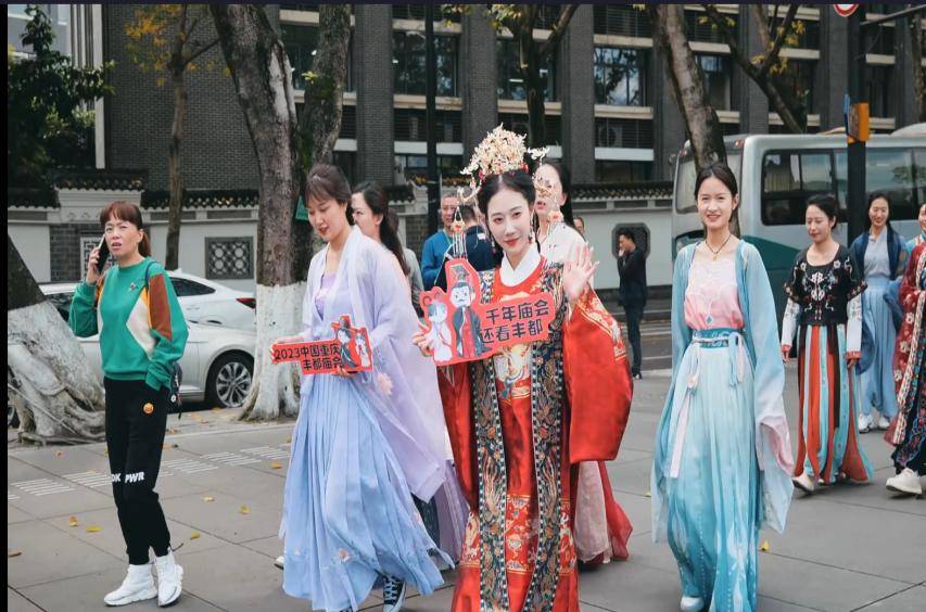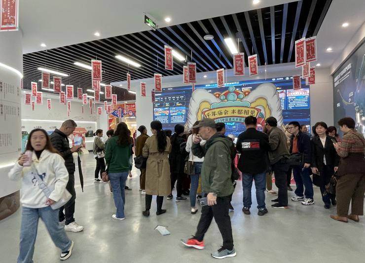 自丰都月活动开始,武陵文旅推广中心围绕丰都各A级景区和极具丰都文化代表性的卡通人物形象“凤祥祥”和“钟福福”,打造丰都文旅主题氛围造景,使得前来打卡的市民朋友以及外地游客络绎不绝。展馆内的祈福装置——象征好运的桃树上也挂满了前来参展游客参与祈福仪式时书写着美好心愿的小卡片。4月23日,数十名身着汉服的小姐姐在中山四路进行庙会主题巡游,为来往市民及游客朋友带来一场视觉盛宴的同时放大丰都庙会传播声音,让更多人感受丰都庙会的魅力。