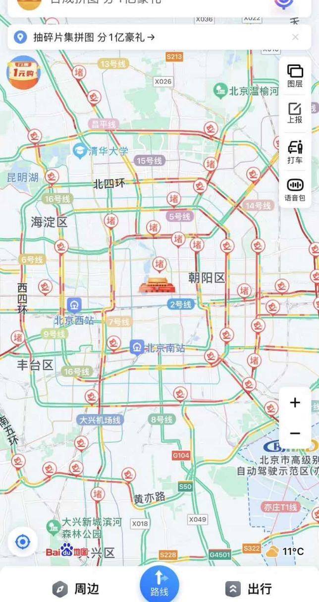 (图/邵先生分享的实时北京地图,大部分路段标注拥堵,亦庄成例外)