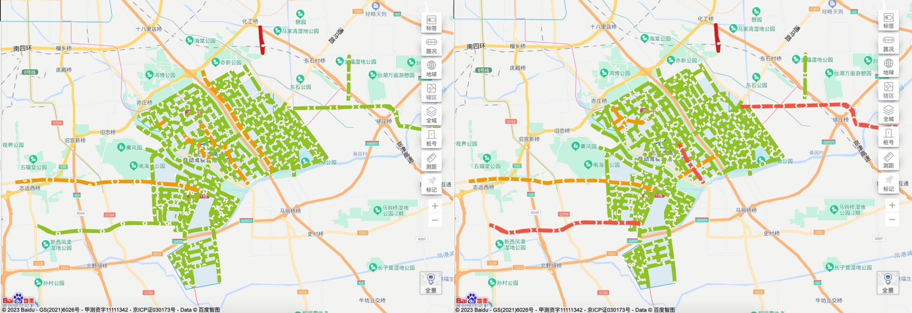 (图/亦庄4月21日与4月28日晚高峰(17:00-19:00)交通拥堵对比)