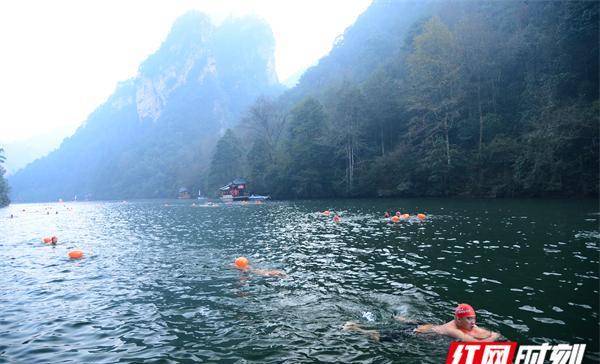 全国冬泳爱好者畅游宝峰湖。( 邓道理 摄)