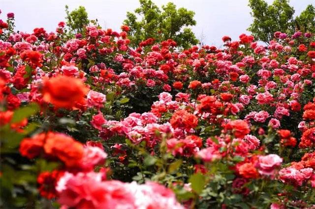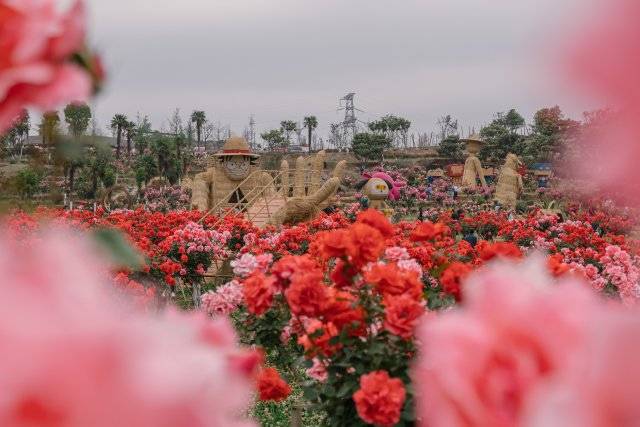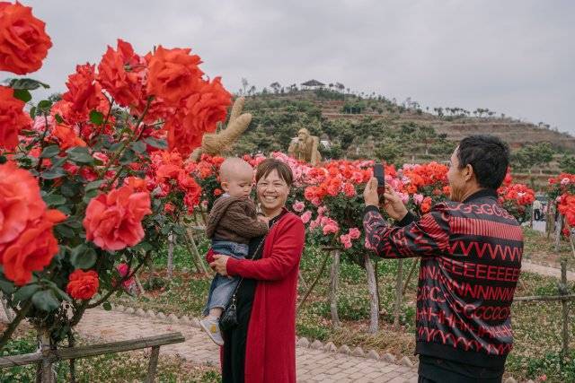 走进这片隐藏在山间的大花园,犹如进入了一个梦幻的童话世界,草亭盖盖,漫山芬芳绚烂,让人赏心悦目。站到高处放眼望去,大片大片的月季花尽收眼底,从艳红到深褐,从淡黄到橘红,从洁白到浅紫,色彩分明,像是为四月的大地绣上了一条通向天边的格子花毯;青翠山岚环绕,湛蓝天空映衬,洁白云朵点缀,一幅五彩斑斓的夏日油画徐徐展开。