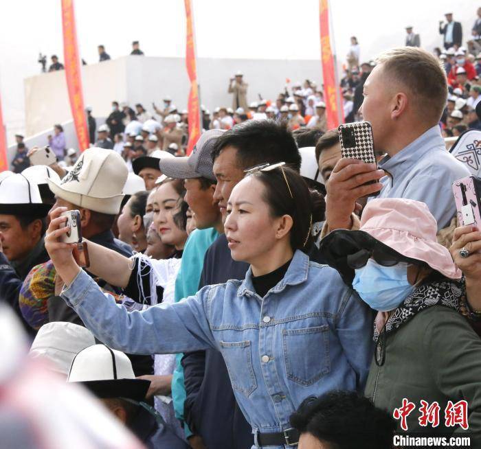 29日上午,新疆阿合奇县猎鹰文化旅游节正式拉开帷幕,疆内外游客手机拍照分享。 陶拴科 摄