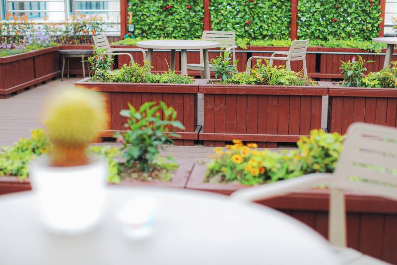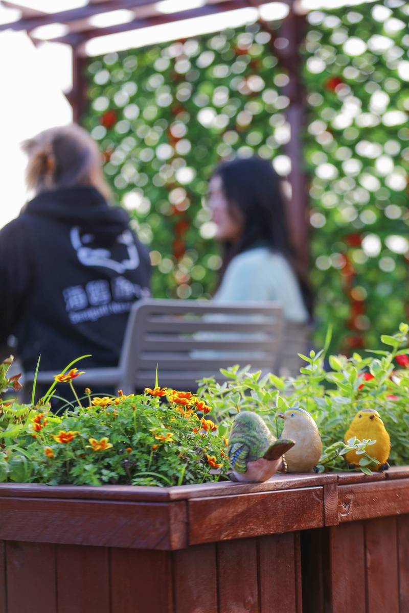 而在上海对外经贸大学的校园里,还有一些被忽视的“小众花园”。近年来,学校不断推进基础设施建设和“灰色空间改造”,将部分学院楼顶露台打造成师生交流空间的“空中花园”,让自然延伸到楼宇之上,形成一个环境优美、安静舒适的师生交流空间——这也弱化了自然与建筑之间的边界感,让师生更加亲近自然,珍爱身边的环境。