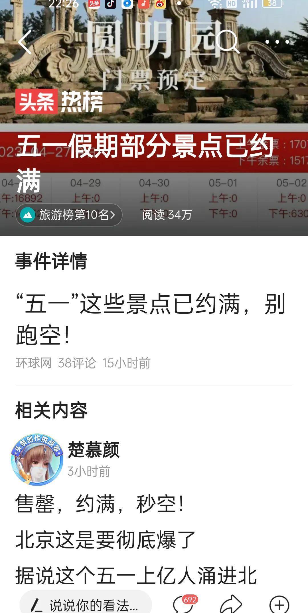 第四,全国人民的旅游热情高涨。你看,北京故宫的门票才放票半个小时就被强光,这是啥子情况,有钱也去不了啊,没票了。