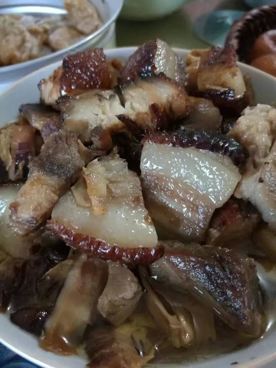 村子里每户人家,都会从生产队或杀年猪亲戚那里买上十斤八斤猪肉,刮毛洗净放进大铁锅煮至六七成熟,然后拌上红糖蜂蜜水扔进高温油锅煎炸至金黄色,然后捞起放回大铁锅,与大罗卜块和油菜头一起,再加上整鸡整鸭一起混煮,直至熟透捞起晾干,再切成厚厚的肉块再放回小锅配料焖烂装碗上桌,那油光黄亮,肉香四溢的一大海碗烧猪肉,至今仍是老家年夜饭的头道名菜。