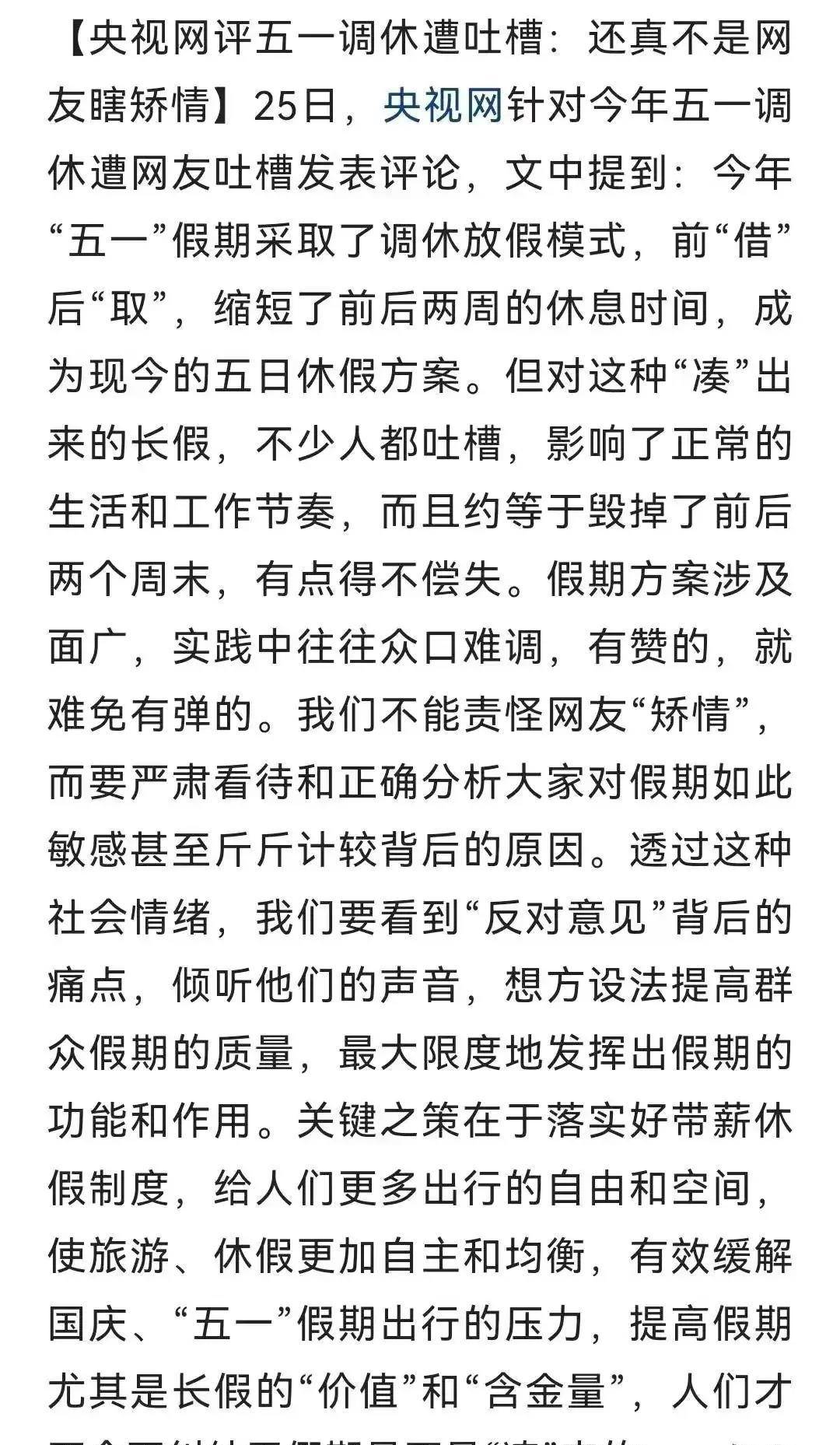 总之,五一假期的调休安排引发了广泛关注与争议。相关部门应该站在大众的角度,更加关注他们的需求,调整假期安排,让大家能够更好地享受假期。政府在照顾人们的休闲需求的同时,也需要考虑如何更有效地促进经济发展。在此基础上,倾听民意、充分吸纳各方建议,合理安排假期,以实现更好的平衡和发展。