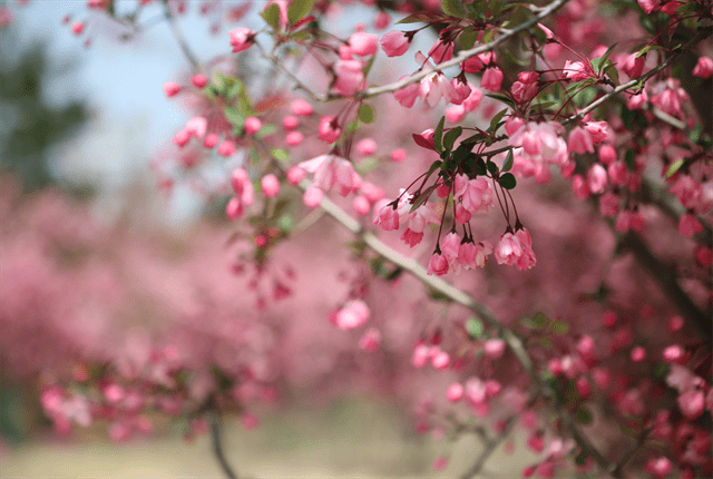 置身垂丝海棠林,玫红色的海棠花朵朵娇羞,远望如彤云密布,美不胜收。微风吹来,轻轻摇曳,娇柔美艳。