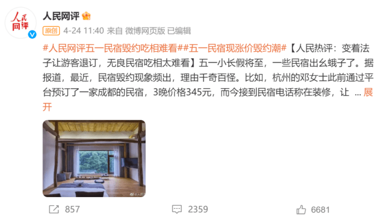 但随着住宿业复苏势头兴起,其快速反弹的弊端也开始显现。在社交媒体上,有大量群体反映遭遇酒店民宿方以装修、暂停营业等各种理由退单,变相涨价,#五一民宿涨价毁约潮#等话题冲上热搜,引起社会各界的广泛关注和不满。
