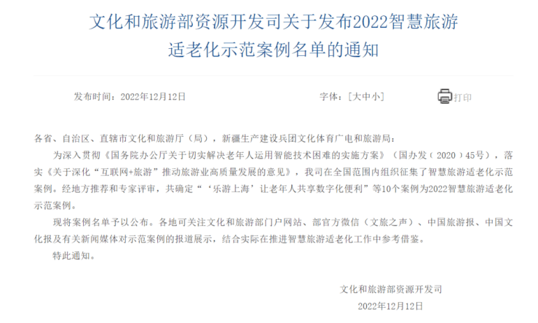 2022年12月14日,文化和旅游部资源开发司发布10个2022智慧旅游适老化示范案例,旨在以发展智慧旅游方式解决老年人出游“数字鸿沟”问题,推动各地通过数字赋能提供更多适老化智能服务产品。
